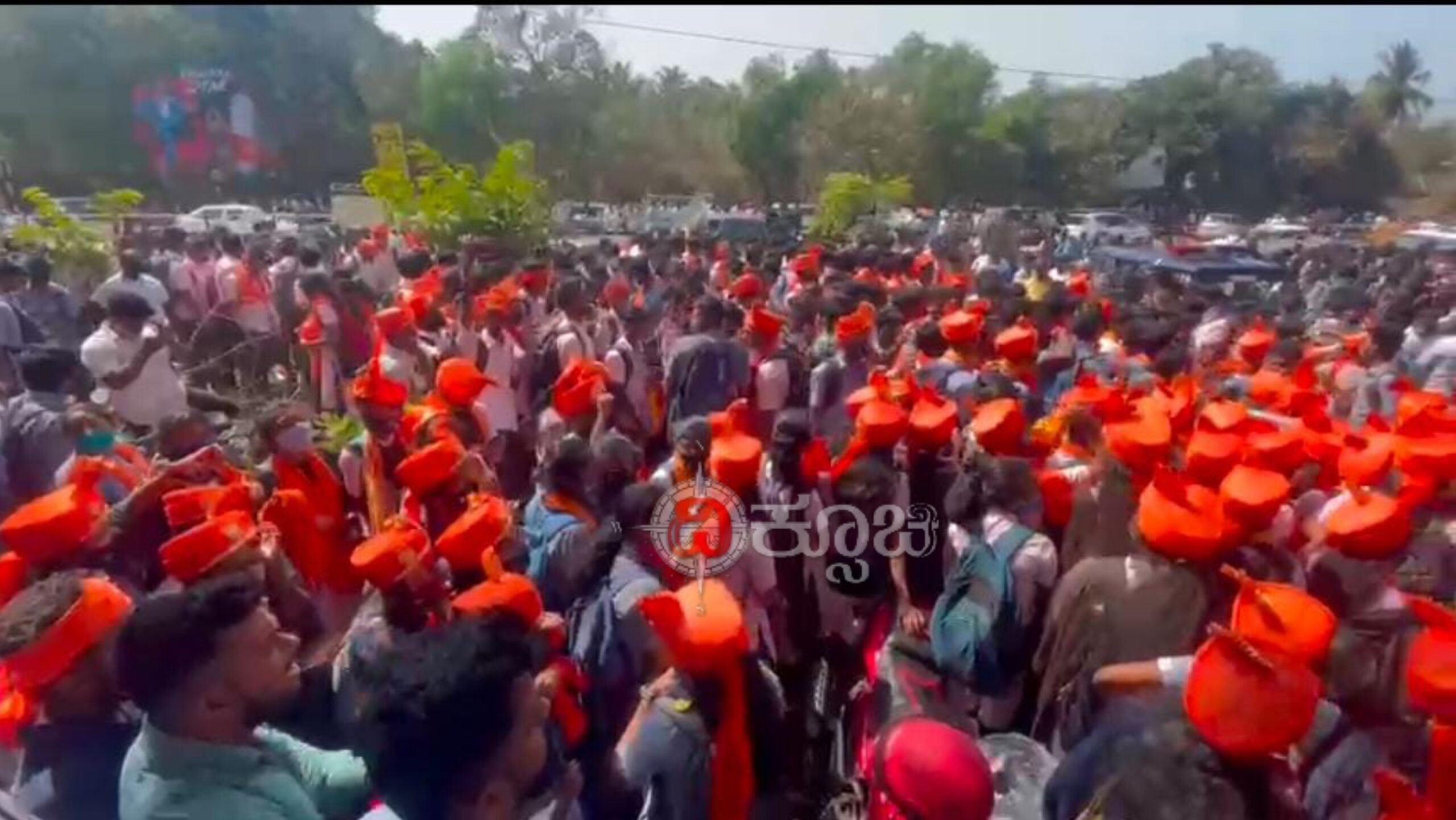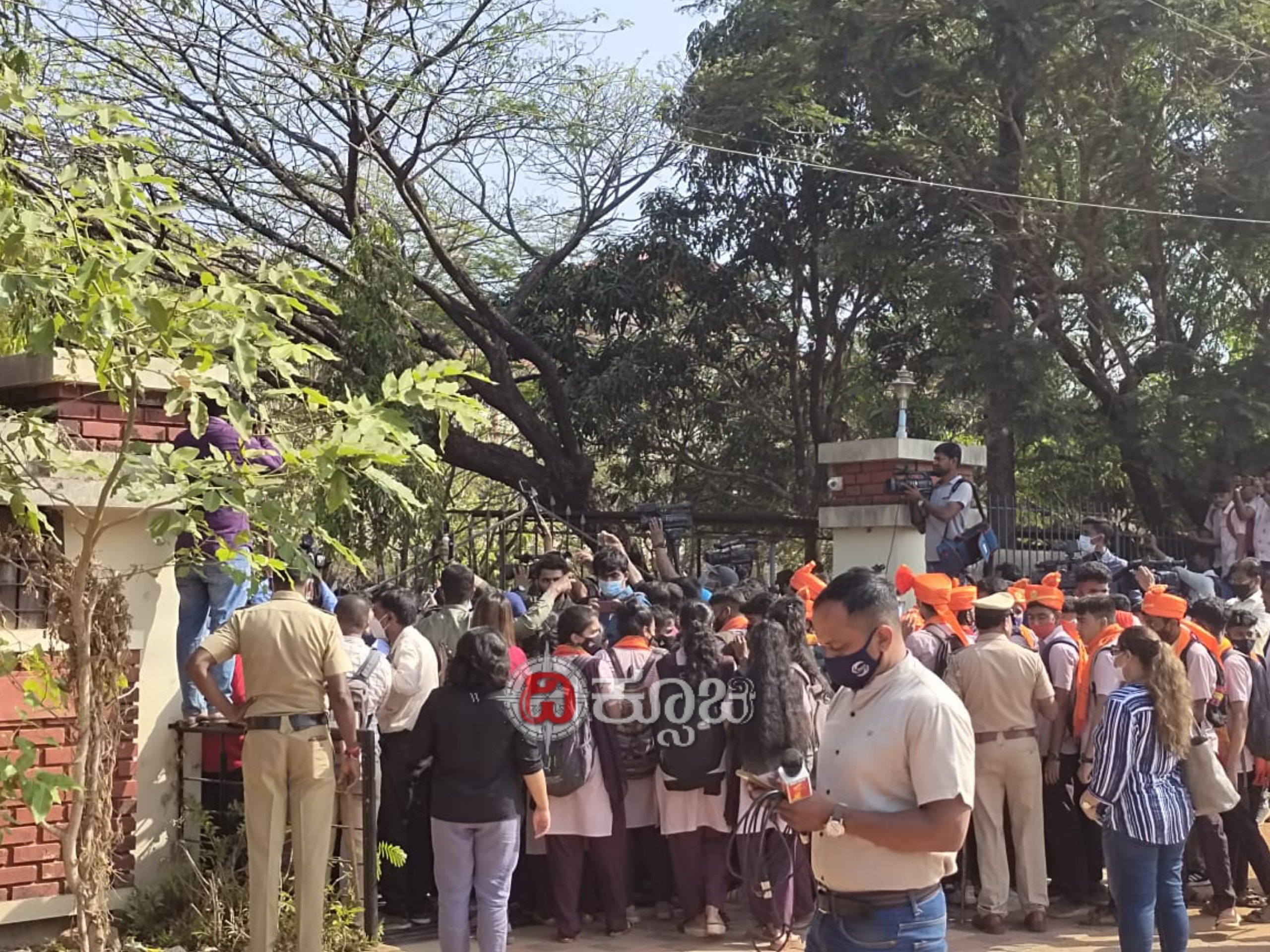 ಇದೇ ಸಂದರ್ಭದಲ್ಲಿ ಕೇಸರಿ ಶಾಲು, ಪೇಟ ಧರಿಸಿ ಬಂದ ವಿದ್ಯಾರ್ಥಿಗಳು ಜೈ ಶ್ರೀರಾಮ್ ಎಂಬ ಘೋಷಣೆ ಕೂಗುತ್ತಾ ಕಾಲೇಜು ಸುತ್ತುವರೆದಿದ್ದಾರೆ. ಪರ – ವಿರೋಧ ಘೋಷಣೆ ಘೋಷಣೆ ಕೂಗಿದ್ದಾರೆ. ಗಲಾಟೆ ತೀವ್ರತೆ ಪಡೆಯುತ್ತಿದ್ದಂತೆ ಕಾಲೇಜಿಗೆ ರಜೆ ಘೋಷಿಸಲಾಗಿದೆ. ಹೈಕೋರ್ಟ್ ತೀರ್ಪಿನ ಬಳಿಕ ಮುಂದಿನ ತೀರ್ಮಾನ ಕೈಗೊಳ್ಳಲಾಗುವುದು ಎಂದು ಆಡಳಿತ ಮಂದಿ ನಿರ್ಧರಿಸಿದೆ.