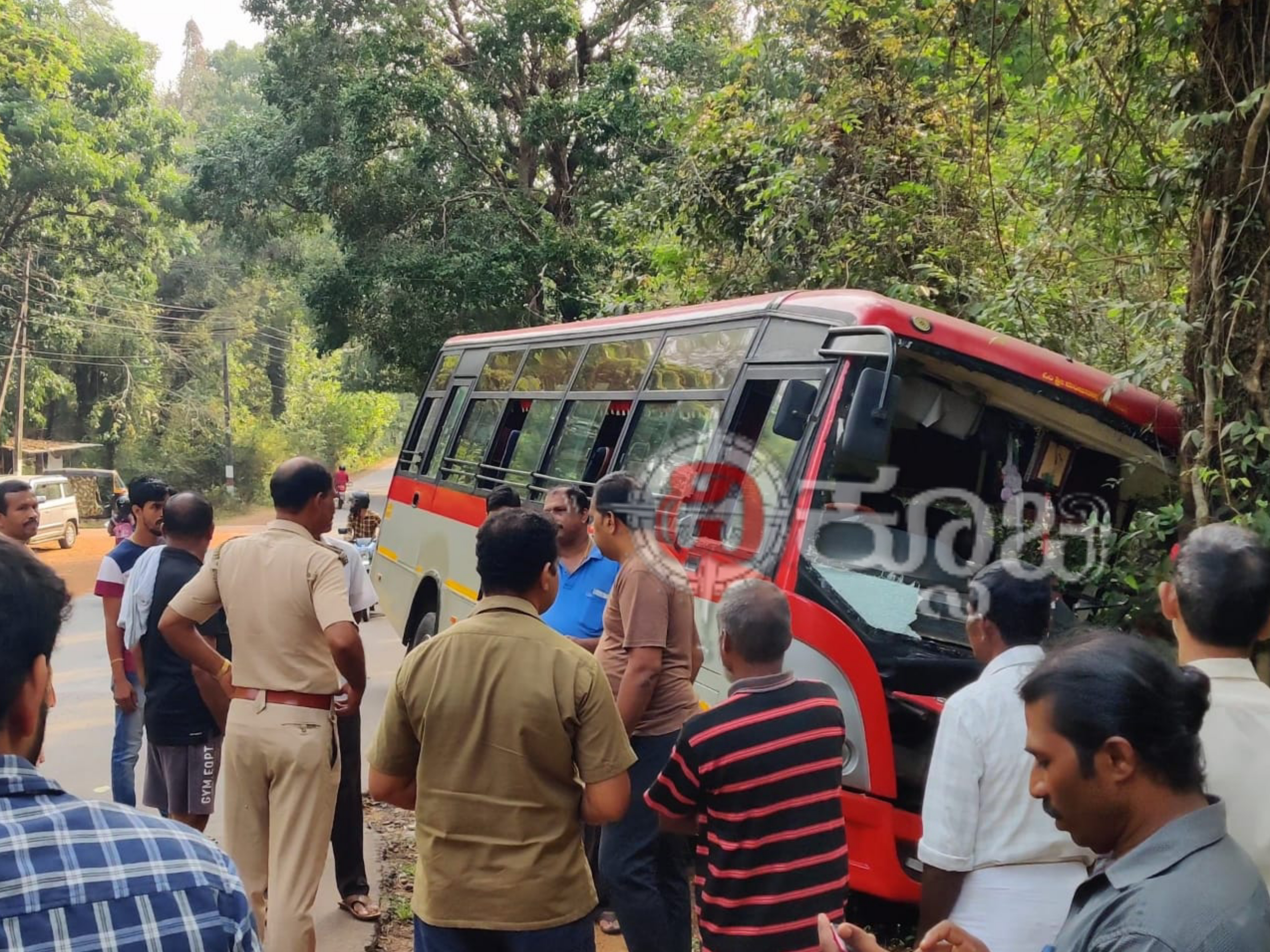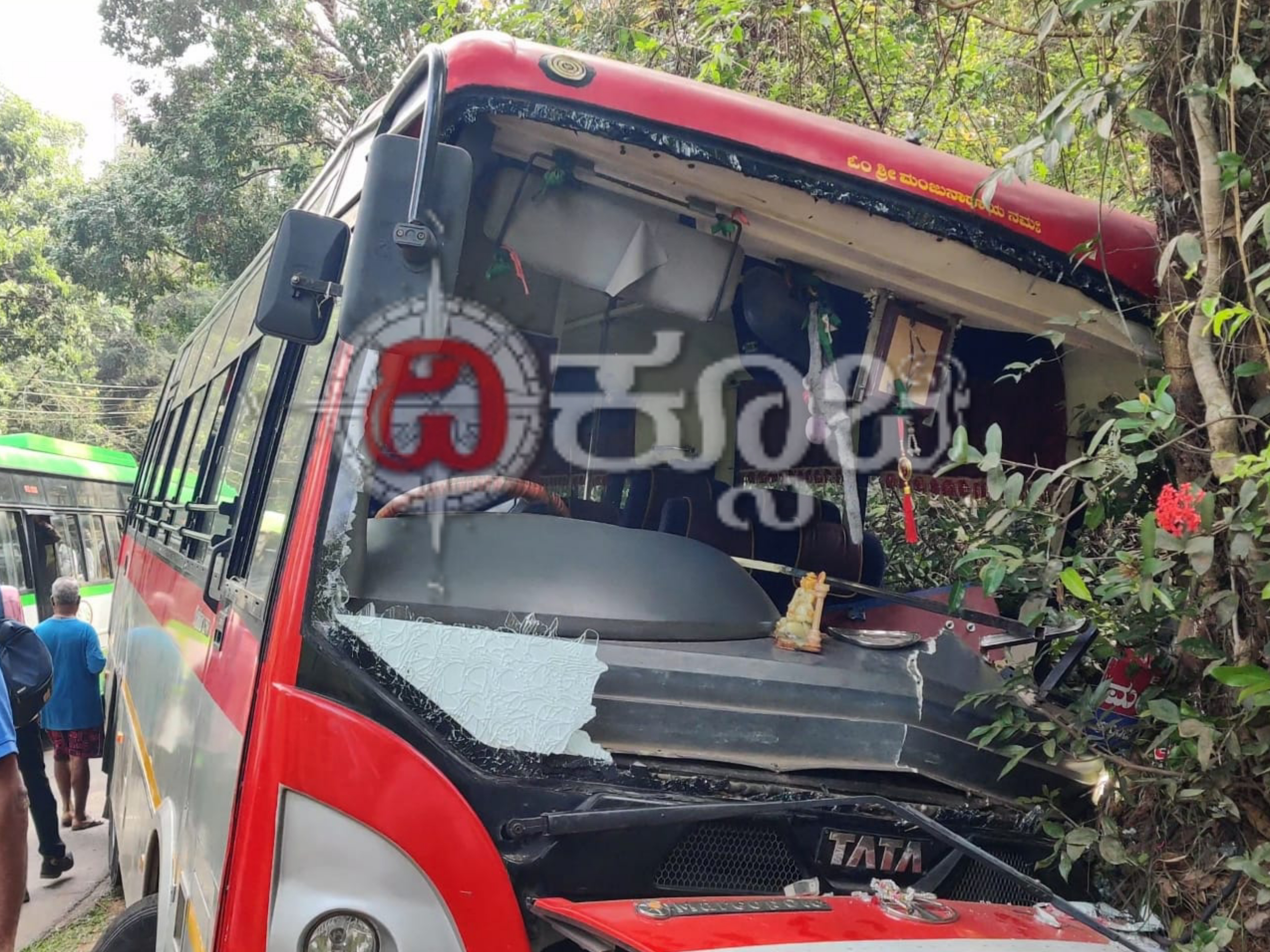 ಬಸ್ಸಿನ ಸ್ಟೇರಿಂಗ್ ಎಂಡ್ ಕಟ್ಟಾದ ಪರಿಣಾಮ ಬಸ್ಸು ಚಾಲಕನ ನಿಯಂತ್ರಣ ತಪ್ಪಿ ರಸ್ತೆ ಬದಿಯಲ್ಲಿದ್ದ ಮರಕ್ಕೆ ಡಿಕ್ಕಿ ಹೊಡೆದಿದೆ.