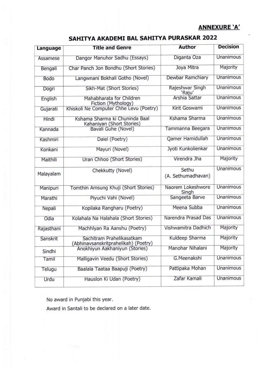 ನವದೆಹಲಿ: ಕೇಂದ್ರ ಸಾಹಿತ್ಯ ಅಕಾಡೆಮಿಯ 2022ನೇ ಪ್ರಶಸ್ತಿಯನ್ನು ಪ್ರಕಟಿಸಲಾಗಿದೆ. ಈ ಬಾರಿ ಕರ್ನಾಟಕದ ಇಬ್ಬರು ಸಾಹಿತಿಗಳಿಗೆ ಪ್ರಶಸ್ತಿ ಲಭಿಸಿದೆ.