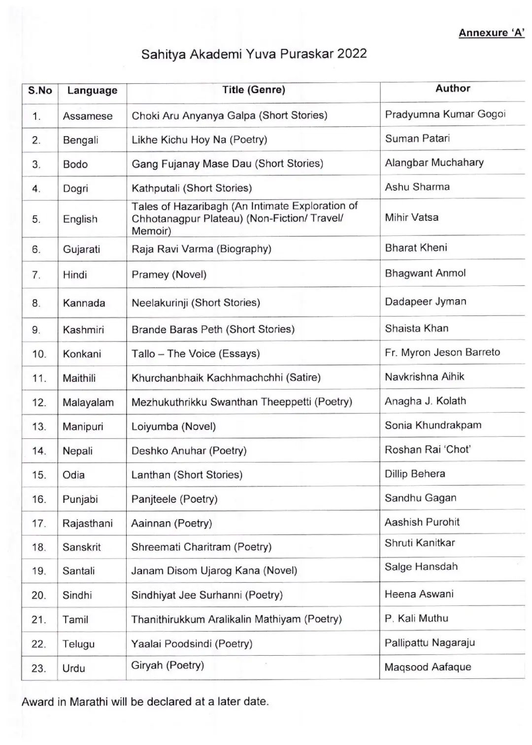 ಈ ಕುರಿತಂತೆ ಕೇಂದ್ರ ಸಾಹಿತ್ಯ ಅಕಾಡೆಮಿಯಿಂದ ಪ್ರಶಸ್ತಿ ಪುರಸ್ಕೃತರ ಪಟ್ಟಿಯನ್ನು ಪ್ರಕಟಿಸಿದೆ. ಅಕಾಡೆಮಿಯಿಂದ ನೀಡುವಂತ ಯುವ ಸಾಹಿತ್ಯ ಪ್ರಶಸ್ತಿಗೆ ಬಳ್ಳಾರಿ ಜಿಲ್ಲೆಯ ಹಗರಿಬೊಮ್ಮನಹಳ್ಳಿಯ ದಾದಾಪೀರ್ ಜೈಮನ್ ಭಾಜನರಾಗಿದ್ದಾರೆ.