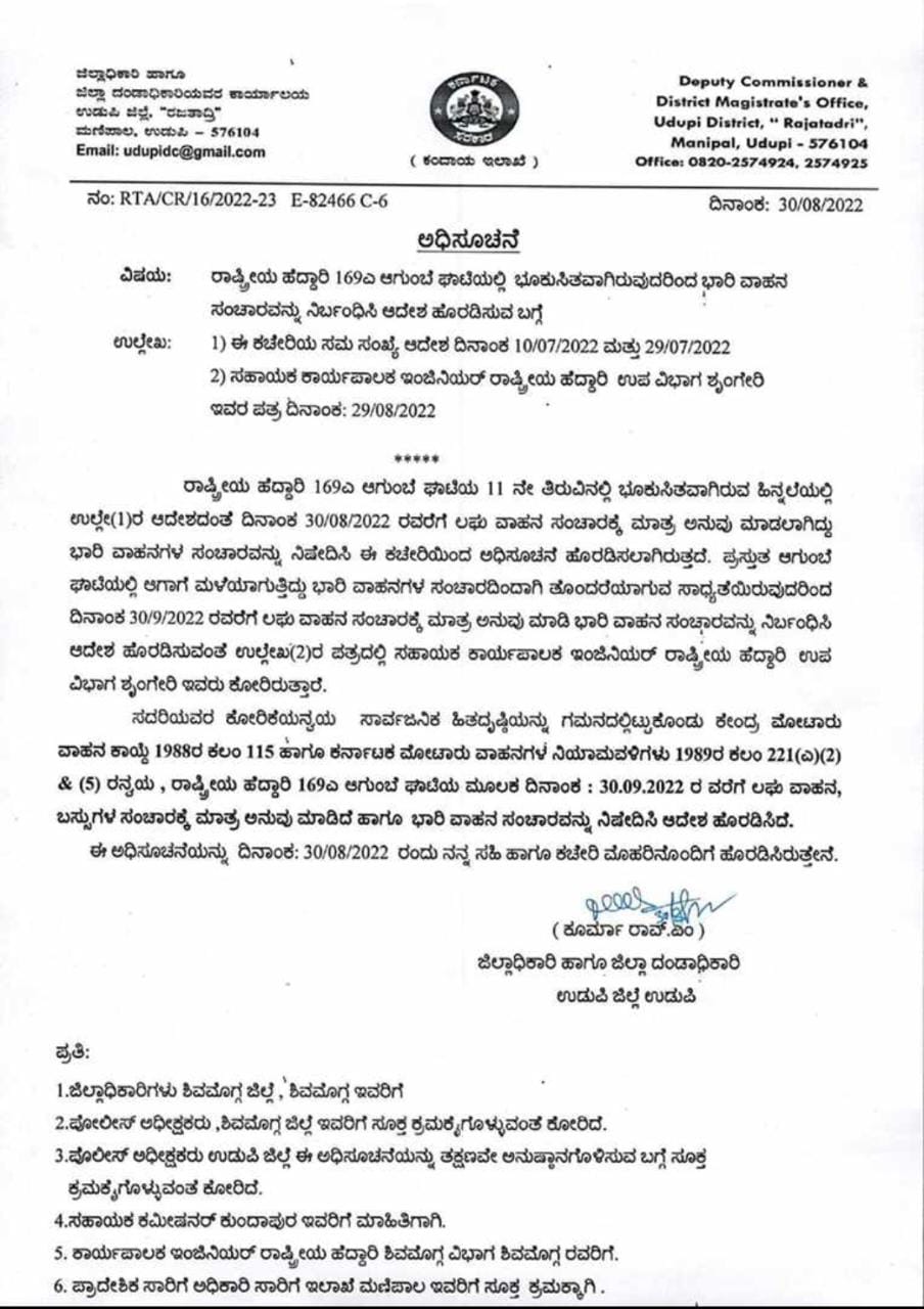 ಆಗುಂಬೆಯ 11ನೇ ತಿರುವಿನಲ್ಲಿ ಭೂ ಕುಸಿತ ಕಾಣಿಸಿಕೊಂಡ ಹಿನ್ನಲೆಯಲ್ಲಿ ಲಘು ವಾಹನ ಸಂಚಾರಕ್ಕೆ ಮಾತ್ರ ಅವಕಾಶ ಕಲ್ಪಿಸಲಾಗಿತ್ತು. ಇದೀಗ ಈ ಆದೇಶವನ್ನು ವಿಸ್ತರಿಸಲಾಗಿದೆ. ಸೆಪ್ಟಂಬರ್ 30 ರವರೆಗೆ ಆಗುಂಬೆಯಲ್ಲಿ ಭಾರೀ ವಾಹನ ಸಂಚಾರವನ್ನು ನಿಷೇಧಿಸಲಾಗಿದೆ.