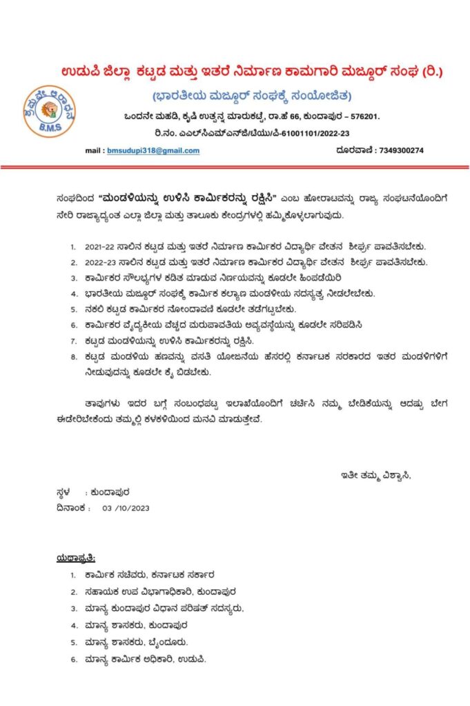ಕುಂದಾಪುರ : ಉಡುಪಿ ಜಿಲ್ಲಾ ಕಟ್ಟಡ ಮತ್ತು ಇತರೆ ನಿರ್ಮಾಣ ಕಾಮಗಾರಿ ಮಜ್ದೂರ್ ಸಂಘದ ವತಿಯಿಂದ ಮುಖ್ಯಮಂತ್ರಿ ಅವರಿಗೆ ಹಾಗೂ ಕಾರ್ಮಿಕ ಸಚಿವರಿಗೆ ಬಿ ಎಂ ಎಸ್ ಸಂಘಟನೆ ವತಿಯಿಂದ ರಾಜ್ಯದ ಎಲ್ಲಾ ಜಿಲ್ಲಾ ಹಾಗೂ ತಾಲೂಕು ಕೇಂದ್ರಗಳಿಂದ ಮಂಗಳವಾರ ಸಹಾಯಕ ಆಯುಕ್ತರ ಮುಖಾಂತರ ಕುಂದಾಪುರದಲ್ಲಿ ಮನವಿಯನ್ನು ನೀಡಲಾಯಿತು.
